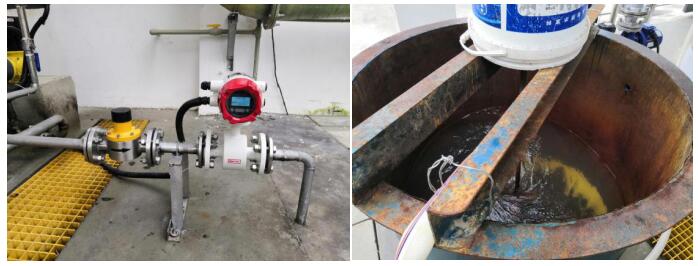 2020年8月,客戶向聯(lián)測成都辦事處反映他們使用的電磁流量計有不讀數(shù)和超聲波液位計屏幕指示燈不亮的情況。接到消息后,聯(lián)測工程師蘭工第一時間趕到現(xiàn)場,檢測過程中發(fā)現(xiàn)通往與管道相連電磁流量計的設備桶內(nèi),銹跡嚴重,由于液體黏稠將銹跡帶入了流量計,覆蓋住了測量電極,影響了流量計顯示。蘭工現(xiàn)場馬上同客戶一起清理設備內(nèi)部,并替換了一臺新的電磁流量計。對原電磁流量計進行清洗后便可正常使用。